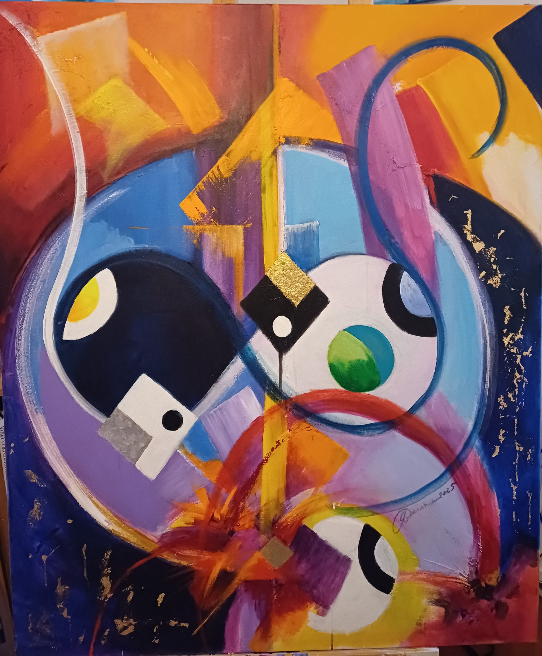 Le mouvement, La dynamique du geste, la couleur sont privilégiés. Des toiles récits et expressions d’un élan intérieur en lien avec le monde , L’acrylique qui sèche vite et permet la rapidité des gestes a remplace les pigments.L’usage de la feuille d’or ou d’argent reste parfois un rappel de l’ancien savoir faire,